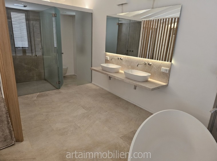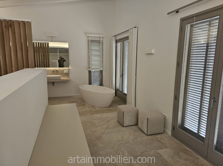 Vier Schlafzimmer mit Bad en suite sind vorhanden sowie ein Gäste WC und ein Technikraum. Ein weiters Zimmer ist als Arbeitszimmer eingerichtet und führt zu dem Garten.