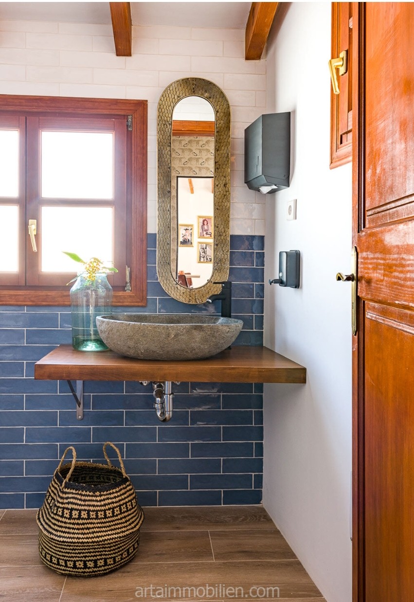 Im Erdgeschoss befinden sich zwei Speisesäle, ein Barbereich, eine Küche und ein behindertengerechtes Bad. Im ersten Stock gibt es zwei Zimmer, eine Terrasse mit Veranda und ein Badezimmer.