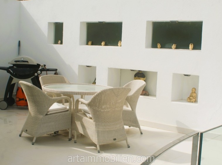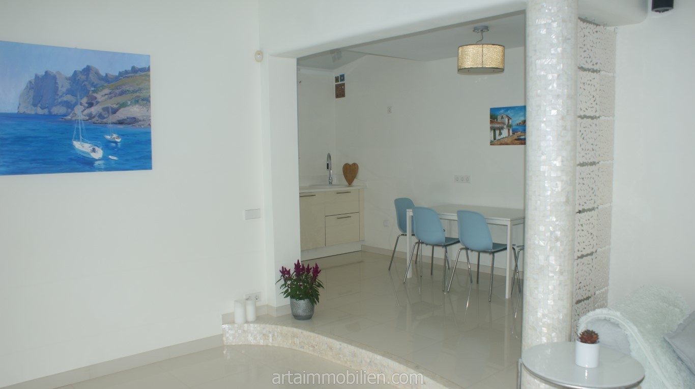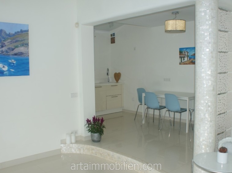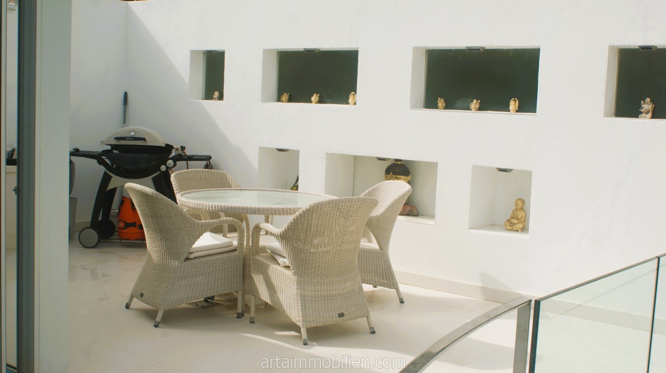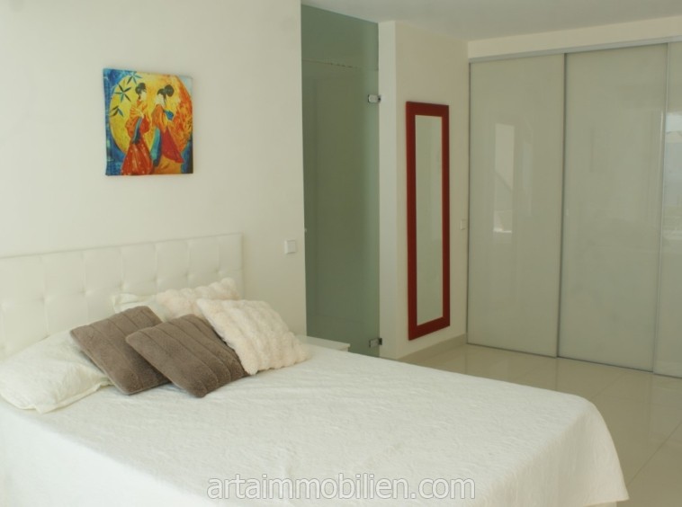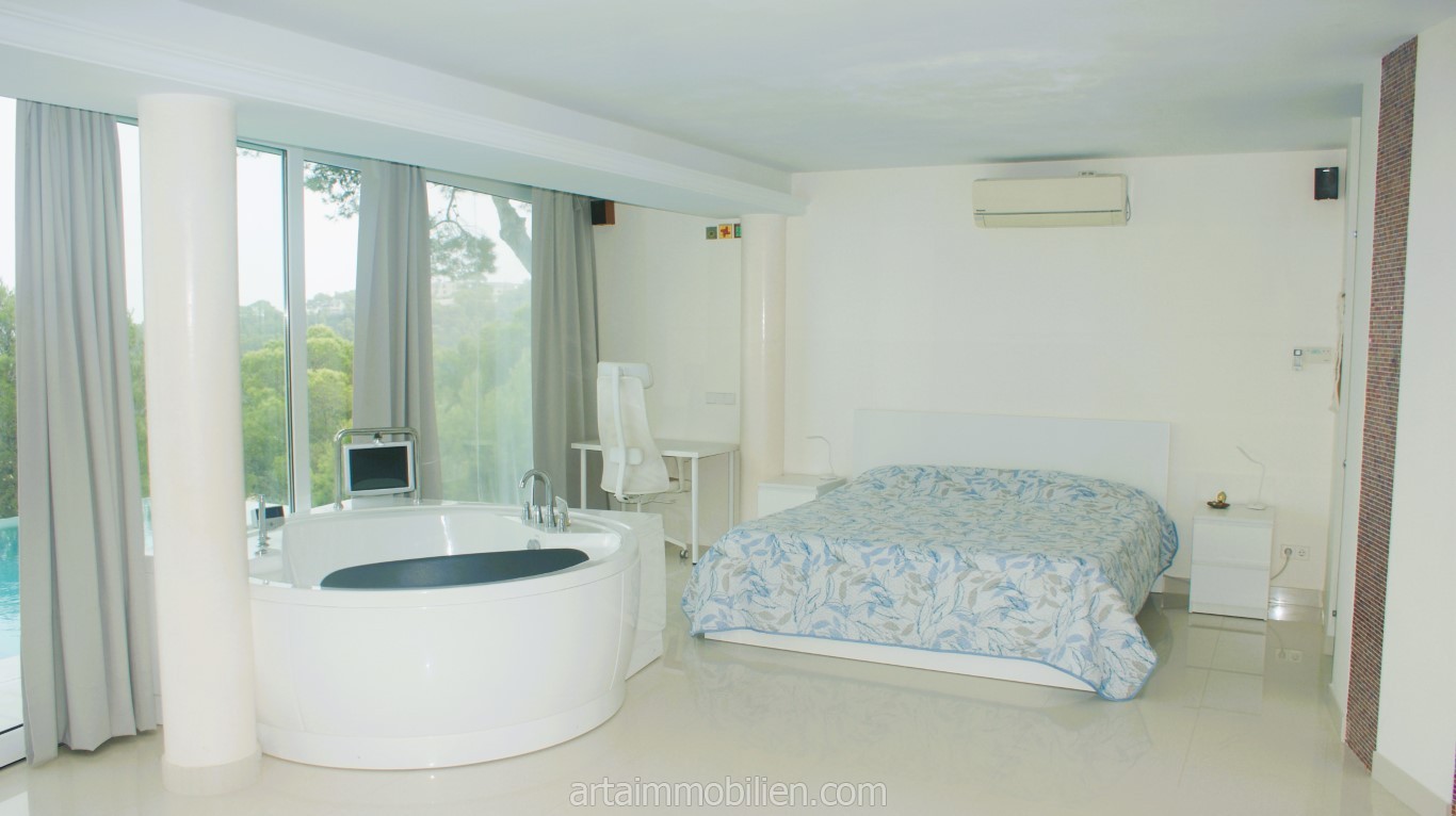 La distribución incluye cuatro dormitorios, cuatro baños (3 en suite) y un aseo de invitados, un amplio salón con techos altos y luz natural, 2 cocinas (una segunda en el sótano), un salón para tomar el té, una bodega, un cine en casa, un lavadero, una sala de máquinas y un trastero. También existe la posibilidad de dividir la villa en dos unidades separadas, cada una con su propia cocina y entrada.