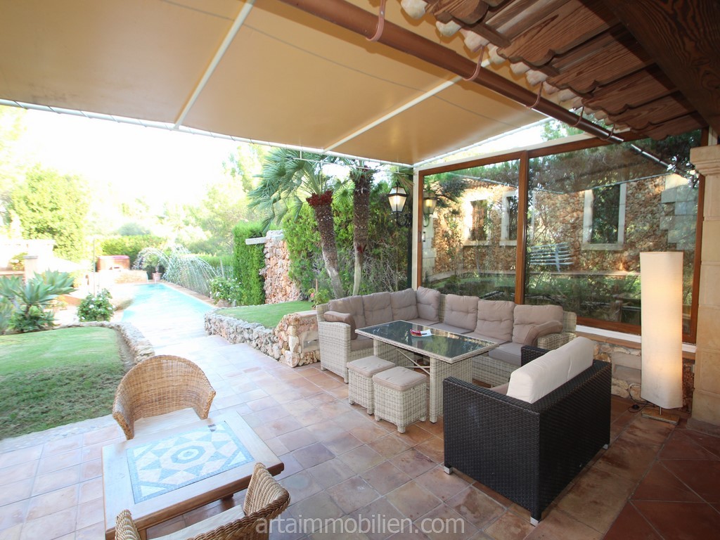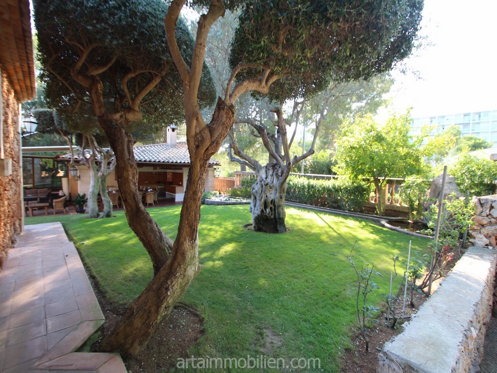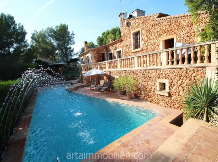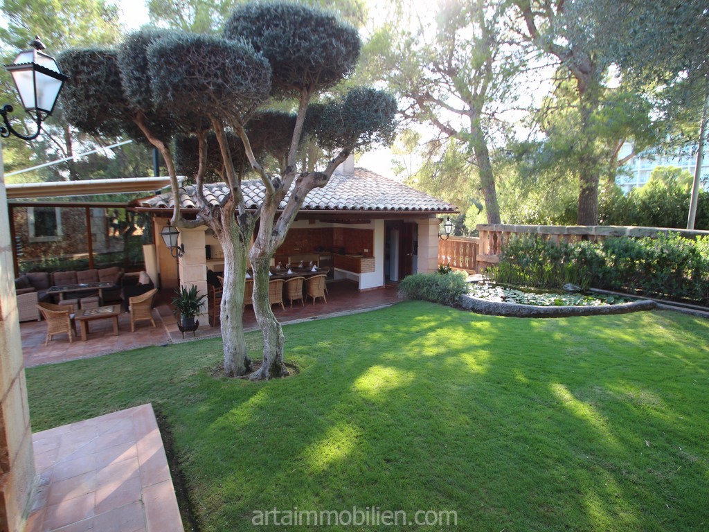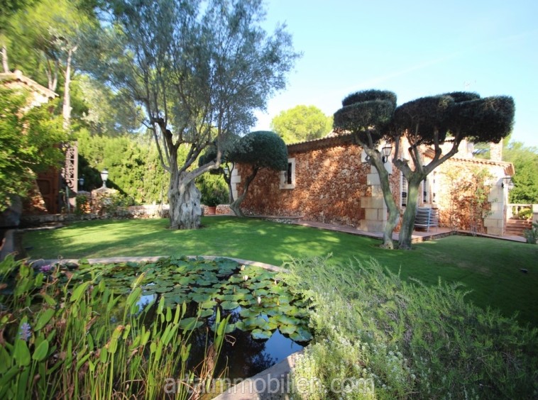 Con un gran jardín cuidado al detalle y un bonito estanque.
