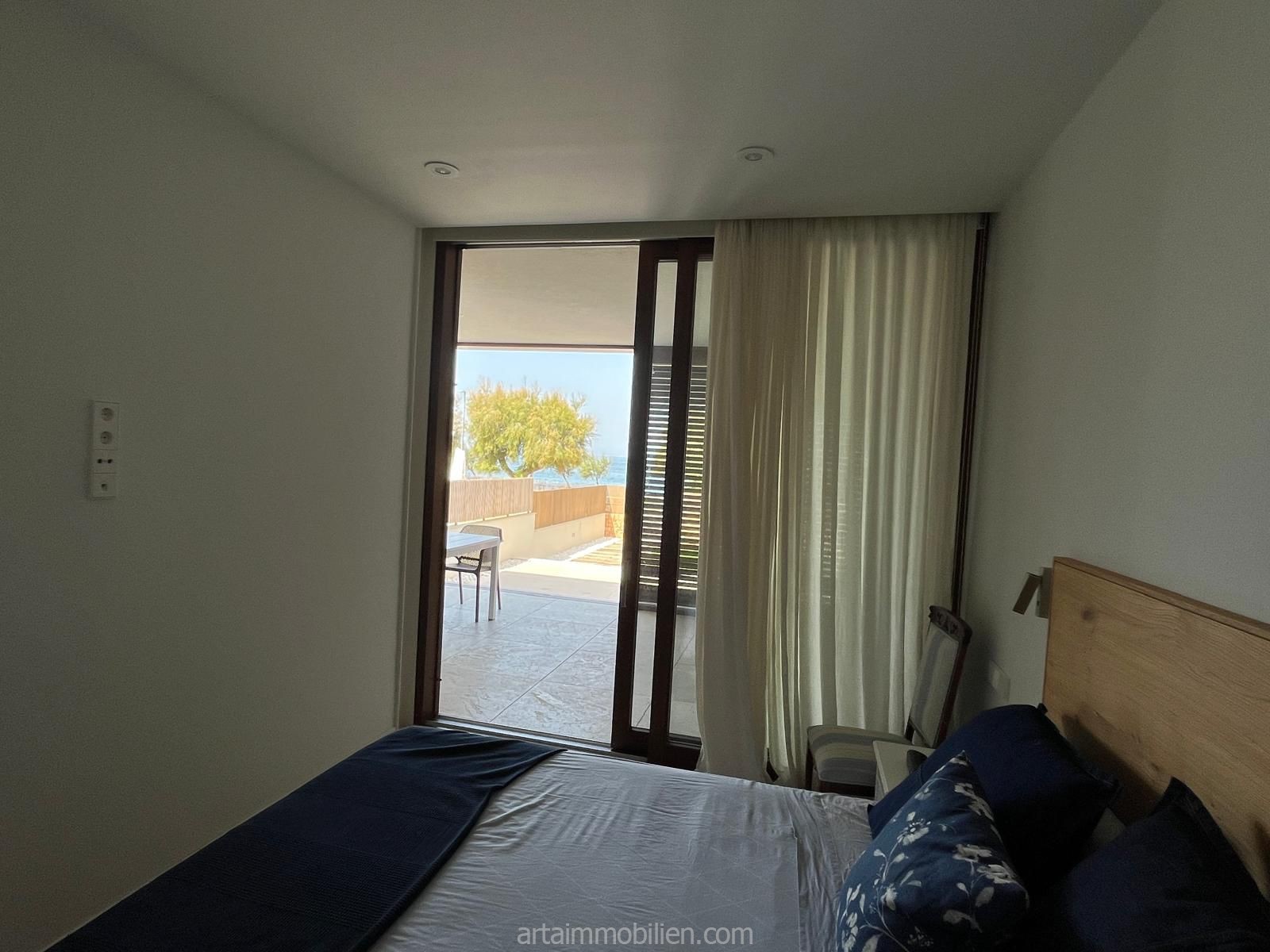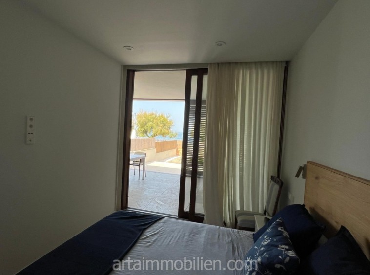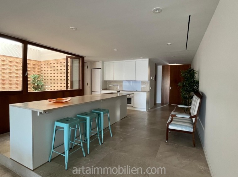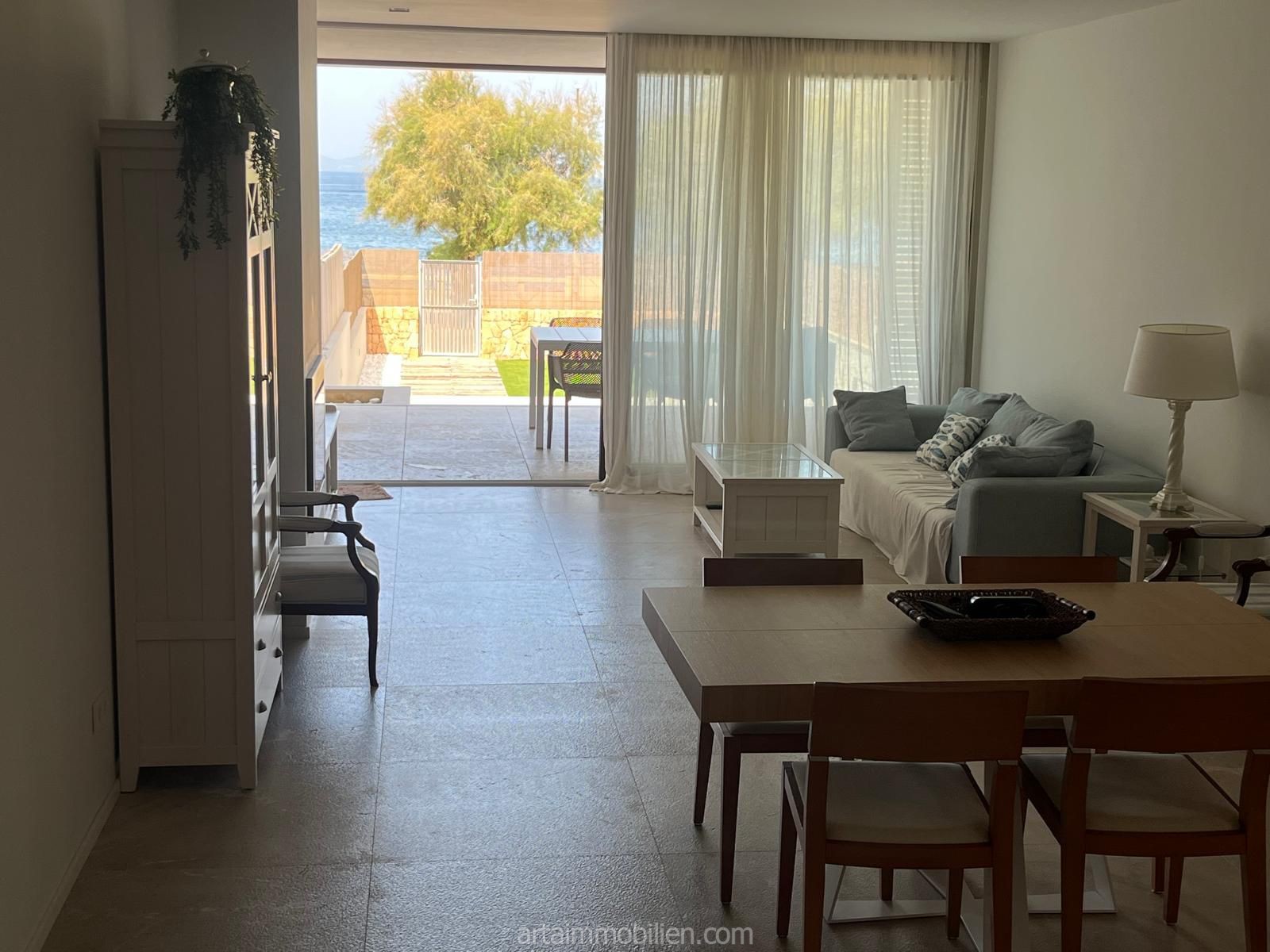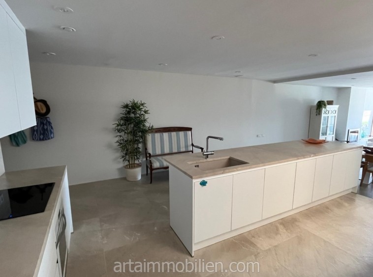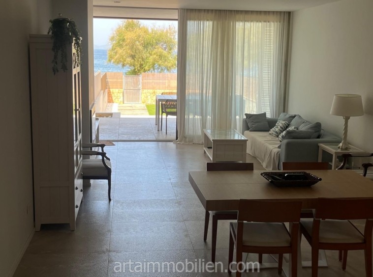 Una sala de estar con chimenea y cocina y comedor abiertos contiguos. Una terraza con vistas al mar en el lado del mar y un balcón en el otro lado y un patio completan este maravilloso apartamento.