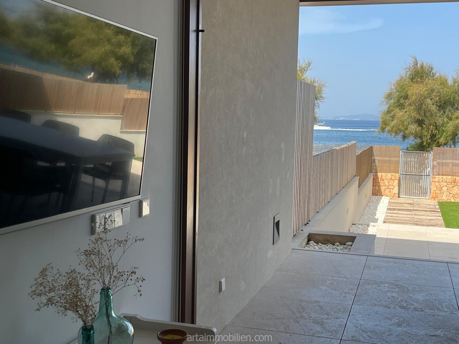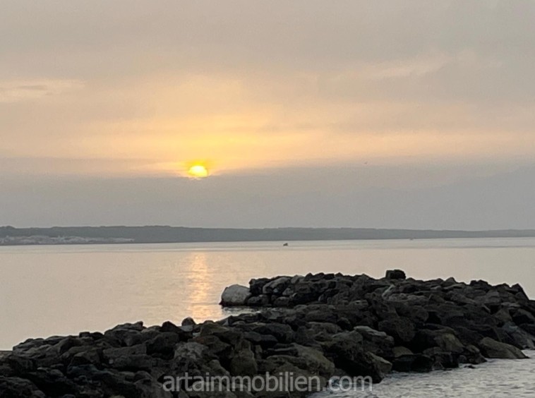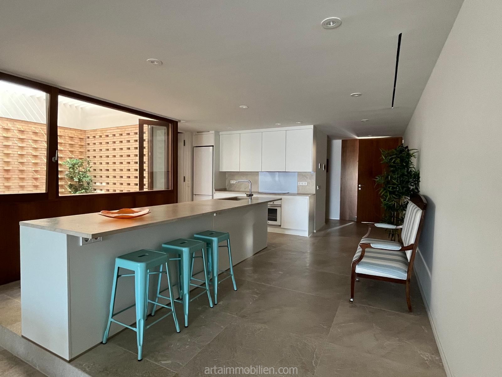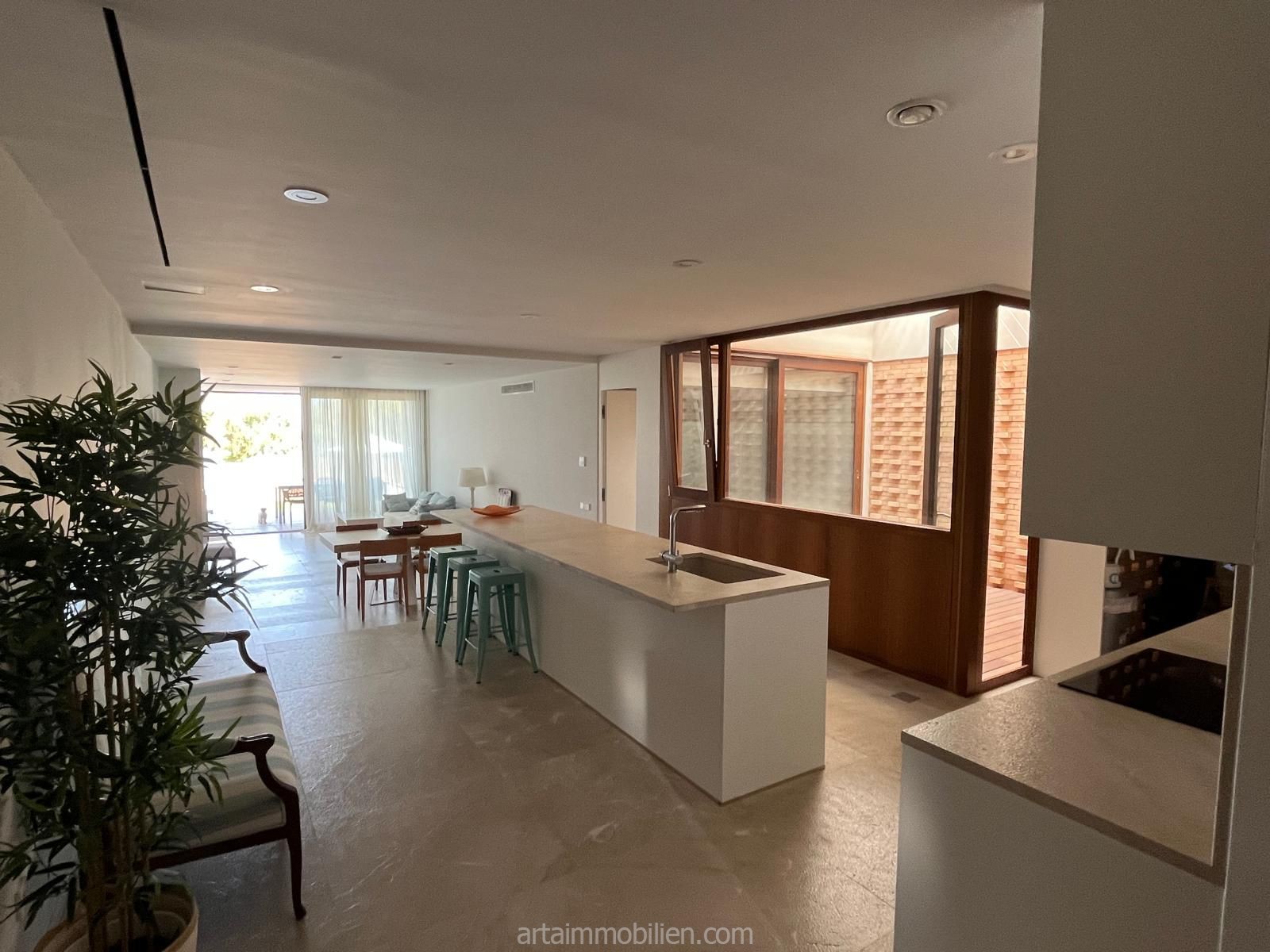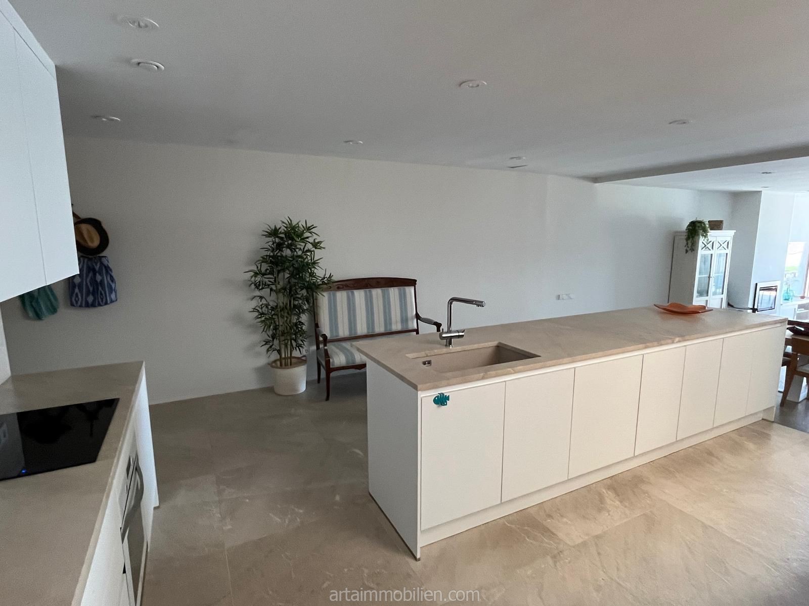 Una sala de estar con chimenea y cocina y comedor abiertos contiguos. Una terraza con vistas al mar en el lado del mar y un balcón en el otro lado y un patio completan este maravilloso apartamento.