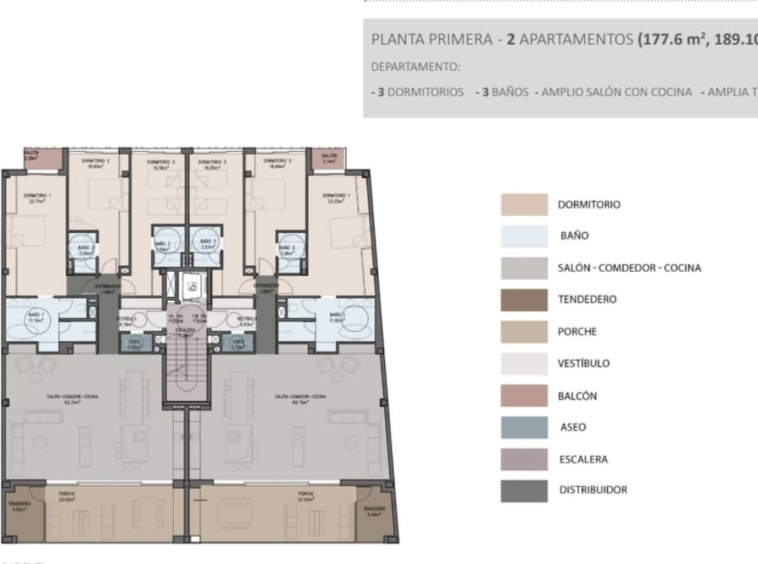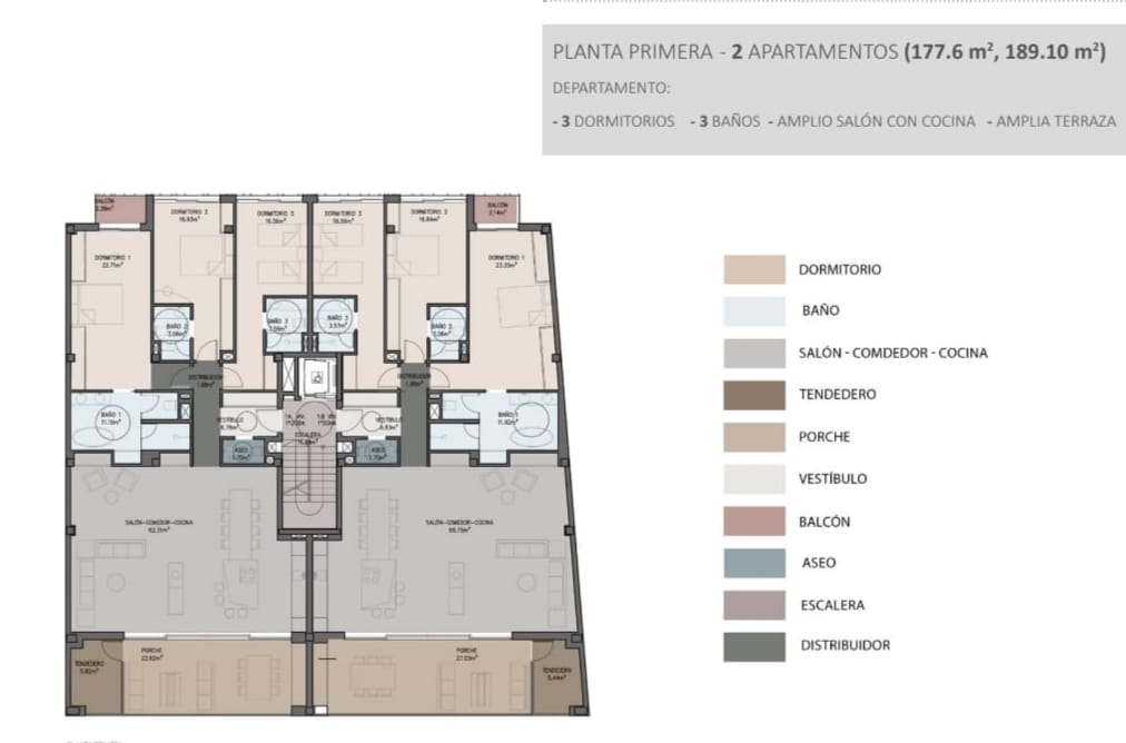 Uno de 189.10m2 y otro de 177.60m2, ambos con sala de estar-comedor con cocina, tres dormitorios, tres cuartos de baño y amplia terraza.